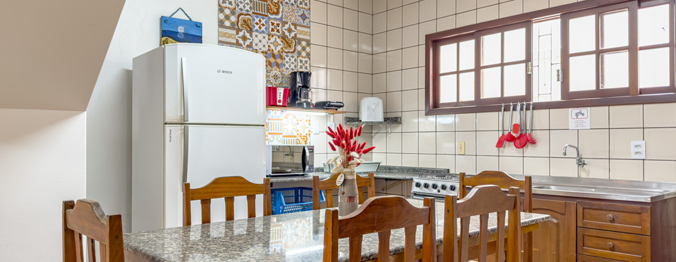 Cocina Completa: Cocina totalmente equipada con fogón, heladera, microondas, cafetera, licuadora, sandwichera, cacerolas y utensilios.