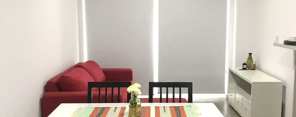 Living-Comedor: Sector social con sofá de dos cuerpos, Smart TV, aire acondicionado y mesa para 4 comensales.