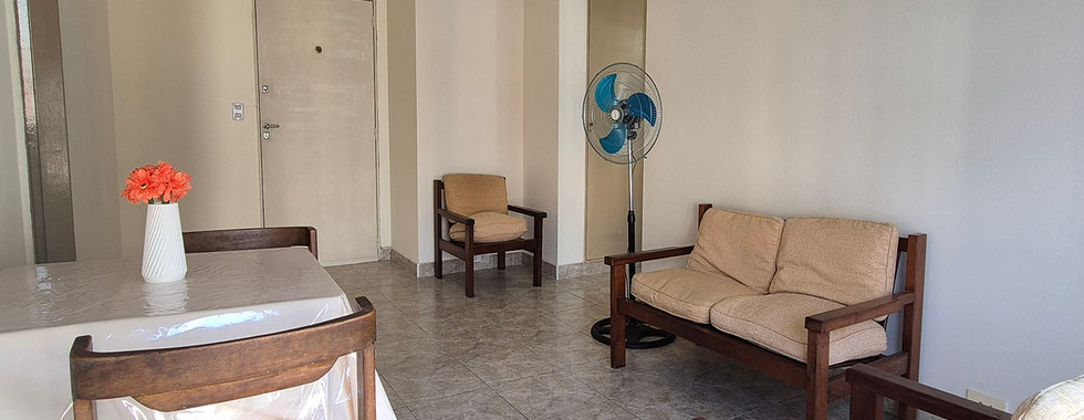 Living / Comedor: Espacioso, con un sofá de dos cuerpos y dos sillones individuales, mesa para dos y salida al balcón corrido.