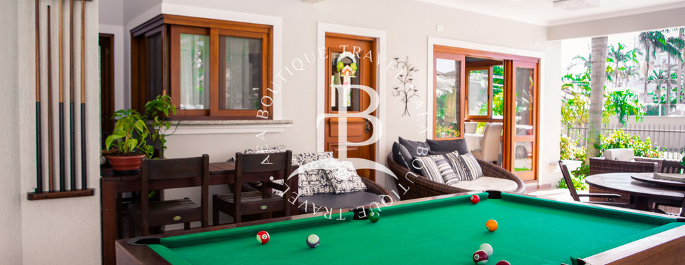 Sala de Juegos: Varanda y área de ocio con Mesa de Sinuca (billar), Mesa de Ping-Pong y amplios muebles de ratán (incluye sofá orbital) para relajarse. También tiene una mesa de comedor convertible.