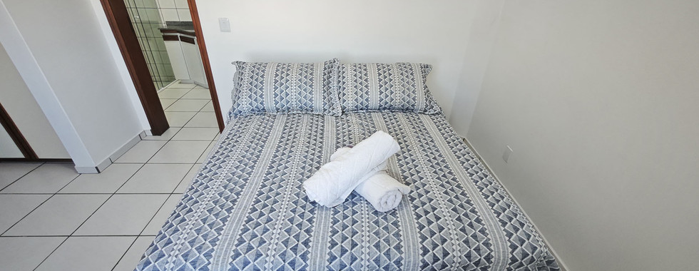 Una suite principal con cama de casal y aire acondicionado.