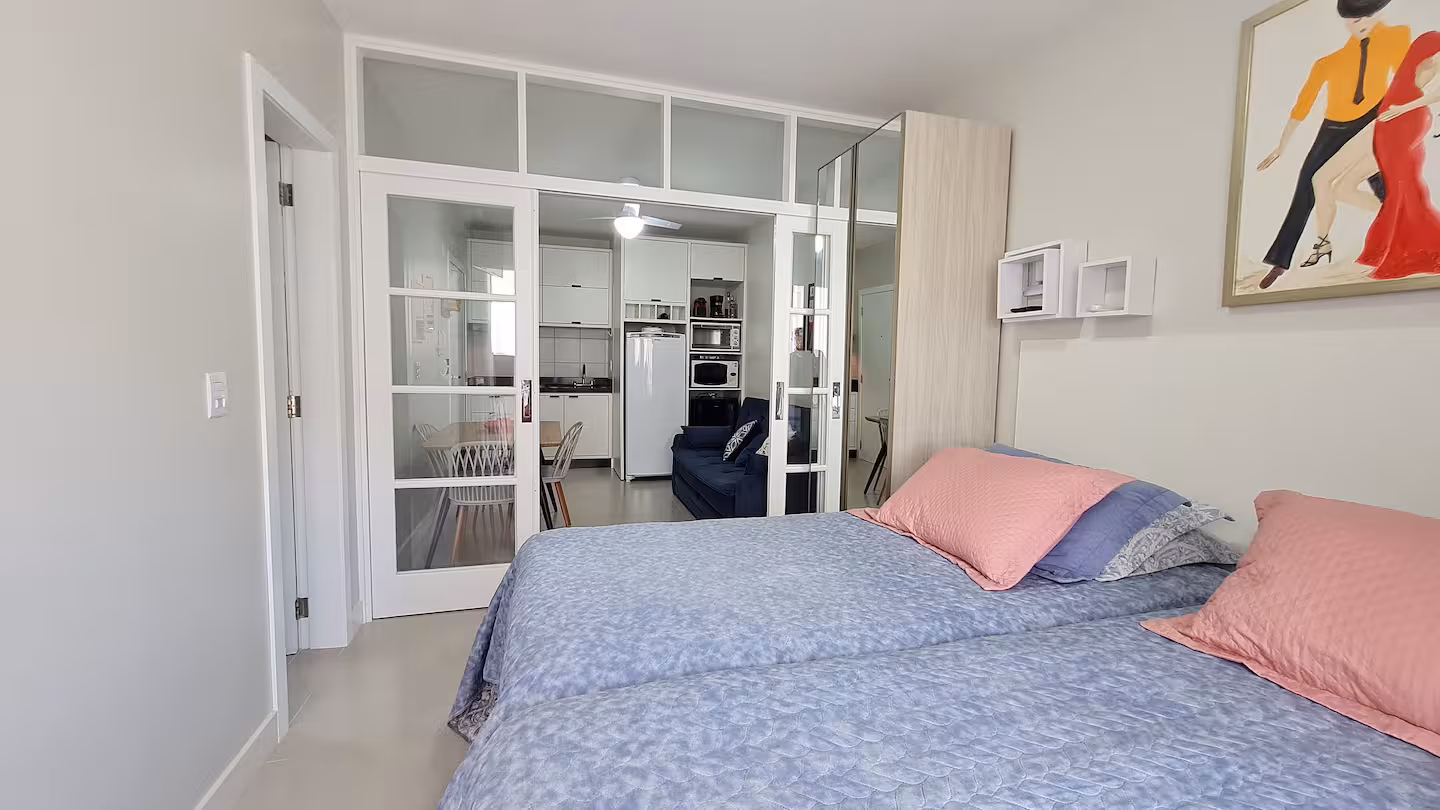 Sala de Estar: Equipada con un sofá cama y una Smart TV, integrada con la cocina para un ambiente abierto y funcional.