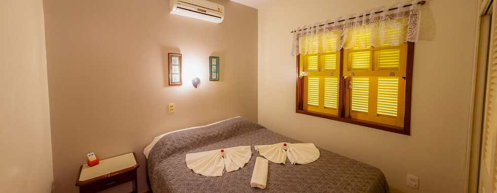 Quarto 1: Suíte com 1 cama de casal ou duas camas de solteiro e ar condicionado.