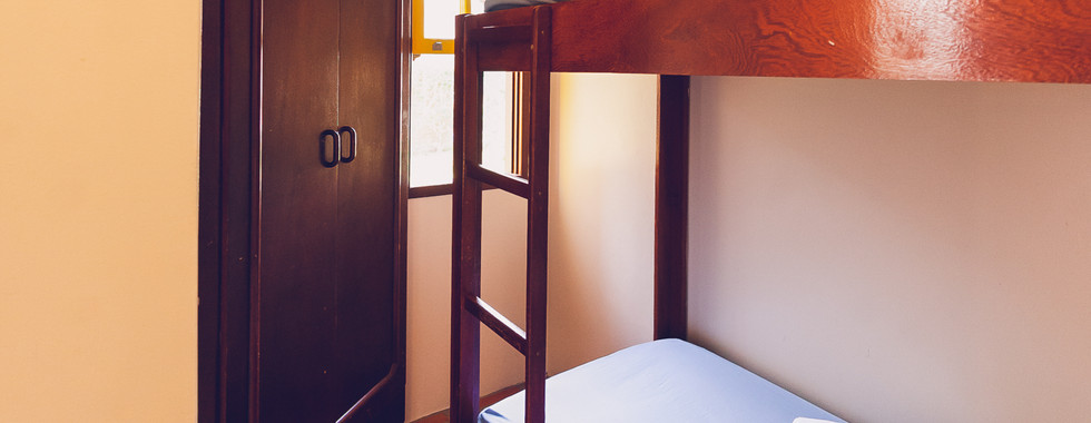 Quarto com beliche: Uma cama de beliche com ventilador de pé, ideal para hóspedes extras.